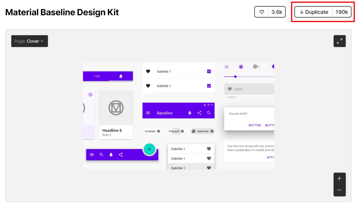 Untuk menggunakannya, Klik Duplicate dan terbukalah project Figma yang berisi semua komponen Material Design.