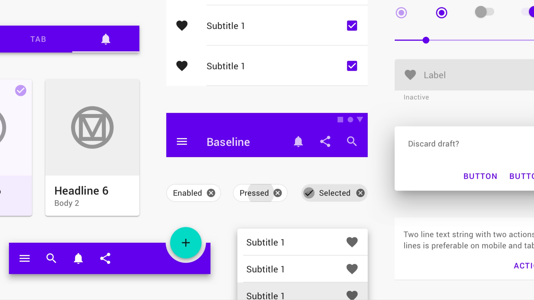 Dalam Google Material Design, disediakan berbagai macam komponen dasar yang bisa Anda gunakan, seperti App Bar, Bottom Navigation, Card, Chips, Dialog, dan lain sebagainya. Anda bahkan dapat menggunakan template pada Figma dengan nama Material Baseline Design Kit seperti berikut: