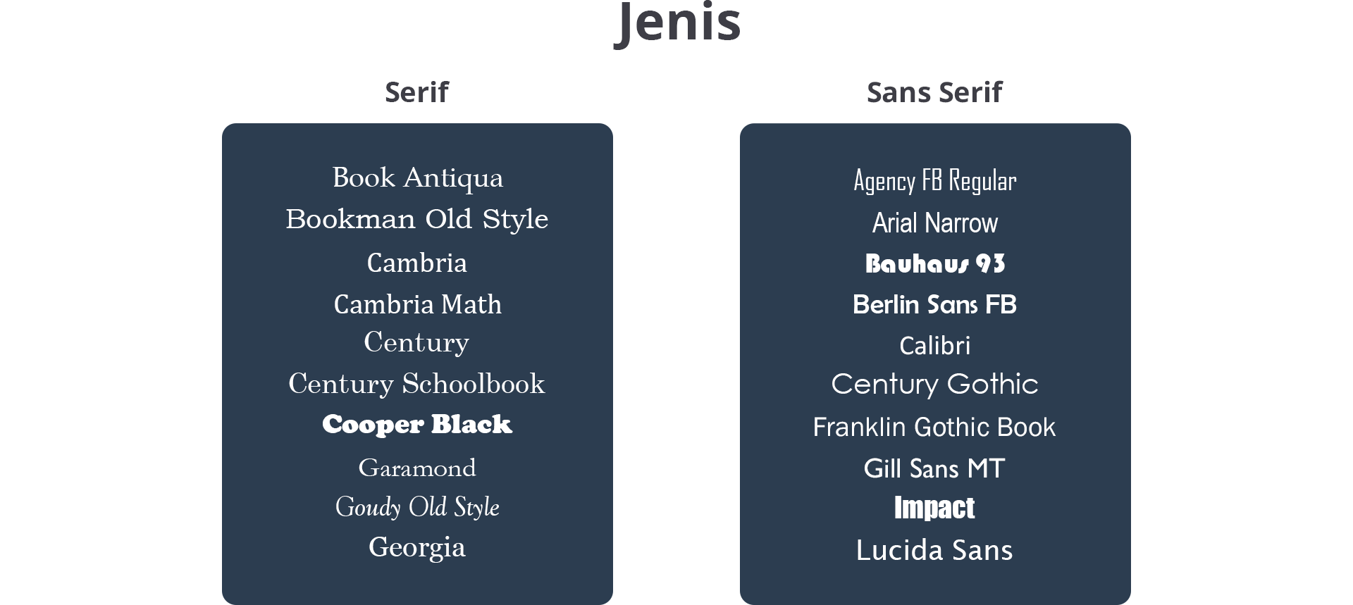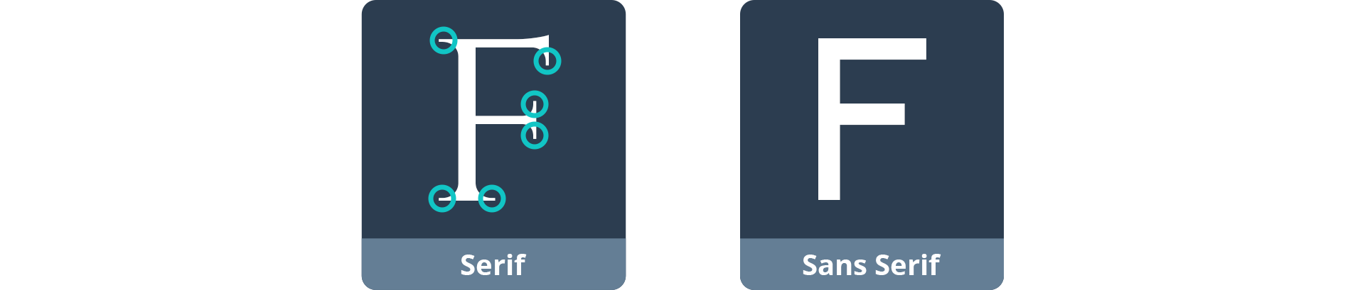 Font jenis Serif memiliki ciri khas berupa tambahan garis kecil di sudut akhir setiap hurufnya yang disebut dengan serif. Font jenis ini memberikan kesan formal dan profesional, contohnya adalah logo lama Google yang dipakai pada sebelum tahun 2015. Sedangkan Sans Serif lebih polos dan simpel tanpa adanya serif. “Sans” sendiri artinya “tanpa” dari bahasa Prancis. Font jenis ini memberikan kesan kasual dan santai, contohnya adalah logo baru yang dipakai Google.