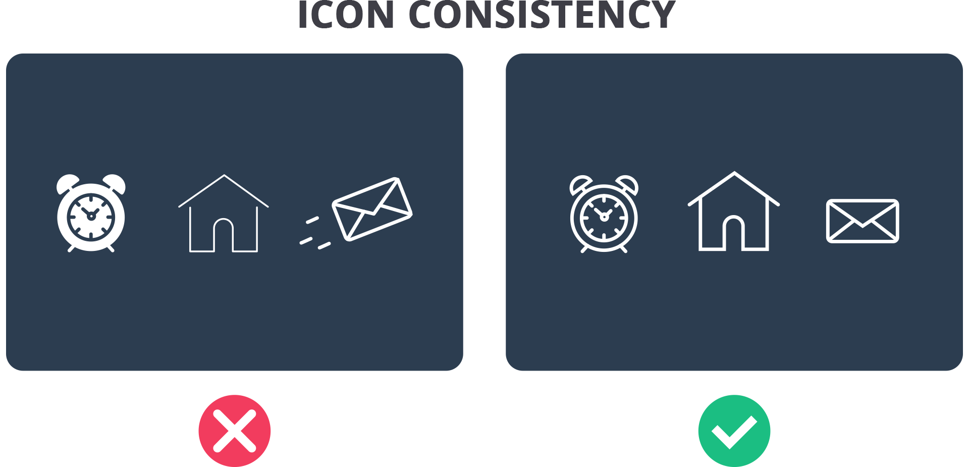Sama seperti elemen lainnya, salah satu tips dalam menerapkan ikonografi adalah konsistensi. Gunakanlah ikon dengan style yang sama untuk semua halaman. Jangan gunakan ikon dengan tipe solid dan outline secara bersamaan. Berikut adalah contoh perbandingannya: