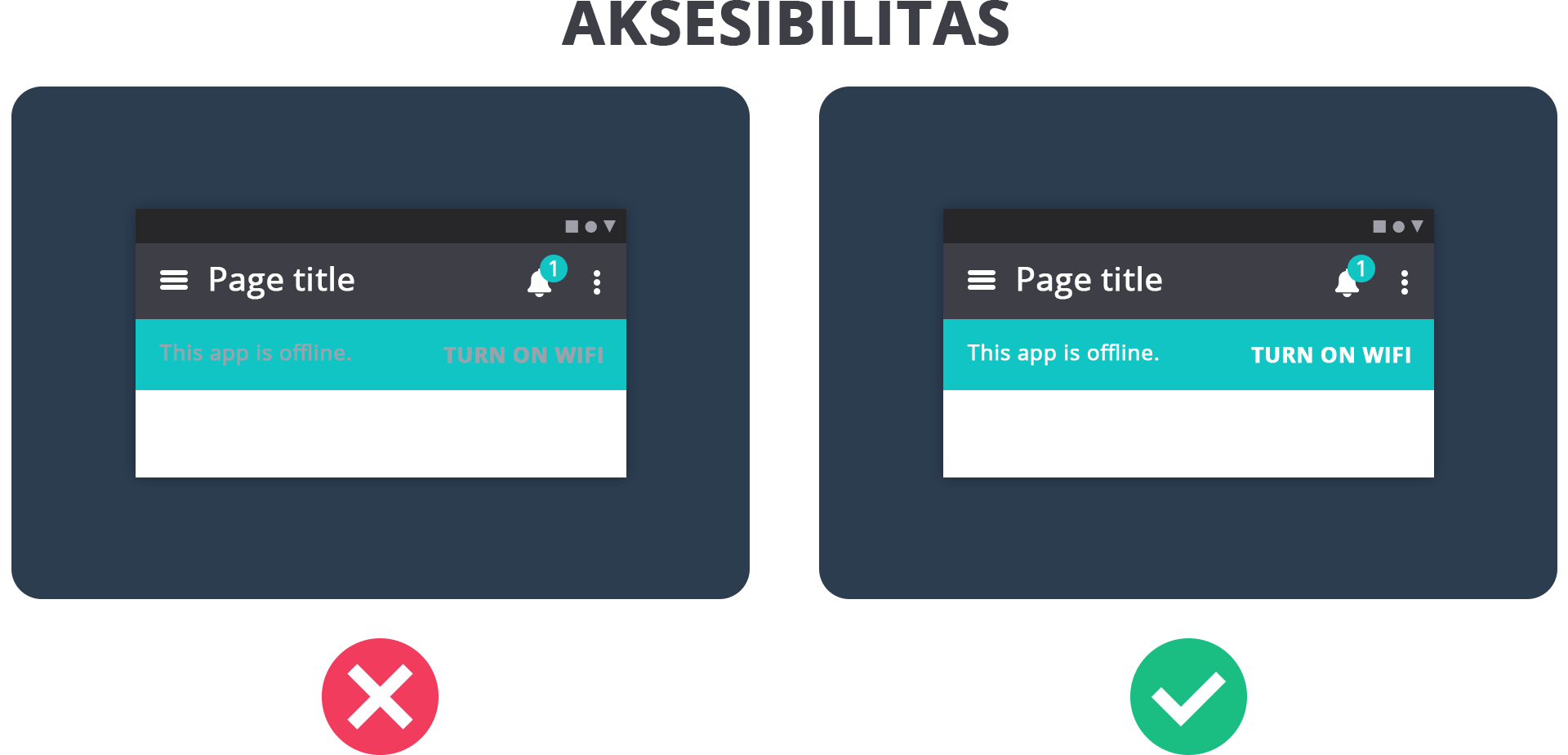 - Aksesibilitas : Gunakan warna yang kontras dengan latar belakangnya sesuai dengan Web Content Accessibility Guidelines (WCAG). Jika warna latar belakangnya terang, jangan gunakan warna teks yang terang juga.