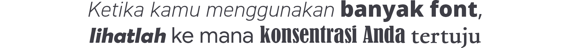 - Consistency : Konsisten dalam ukuran dan font untuk tipe konten yang sama. Jangan sampai dua header yang setara memiliki font yang berbeda. Selain itu, sebaiknya jangan menggunakan lebih dari tiga typeface yang berbeda, karena akan mengganggu konsentrasi.