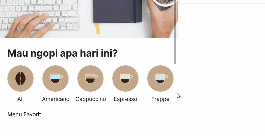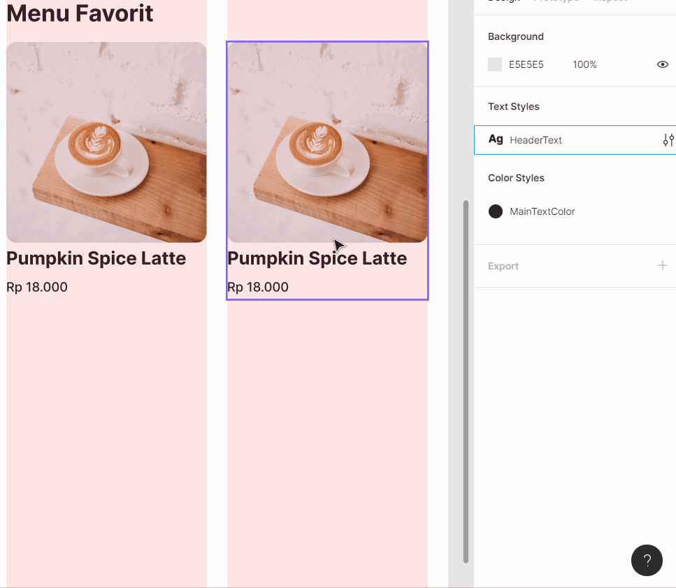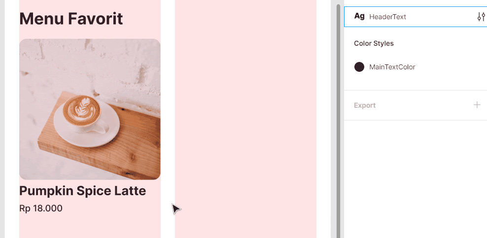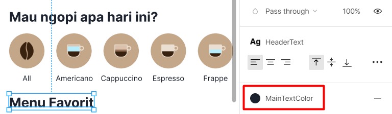 Selain membuat Style pada Text, Anda juga bisa melakukan hal yang sama pada pengaturan Fill (Color), Stroke, dan Effects. Sebagai contoh, berikut adalah Color Style dengan nama MainTextColor yang diambil dari teks “Mau ngopi apa hari ini” yang bernilai 1D232E dan diimplementasikan di teks “Menu Favorit”.