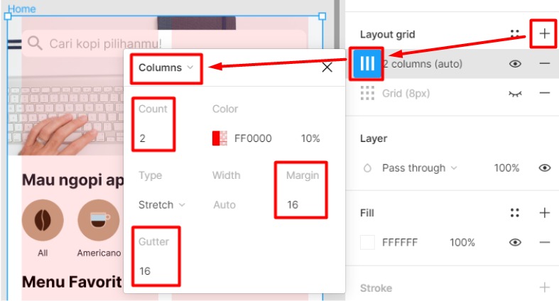 Seperti yang sudah dijelaskan pada materi, selain Grid untuk menambahkan garis bantu berupa kotak-kotak, juga terdapat Layout Grid untuk menambahkan garis bantu berupa kolom atau baris. Caranya, klik ikon tambah (+) pada properti Layout grid → klik ikon Grid → ganti Grid menjadi Columns pada pojok kiri atas → ubah count menjadi 2, margin menjadi 16, dan Gutter menjadi 16 sesuai dengan panduan dari Material Design.
