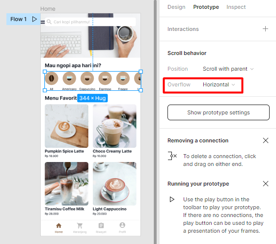 - Untuk mengatasinya, klik elemen Filter Kategori dan pilih Horizontal Scrolling pada Overflow scrolling. Jangan lupa untuk mengubah lebar elemen sesuai dengan lebar halaman supaya elemen tersebut menjadi overflow (melebihi batas).