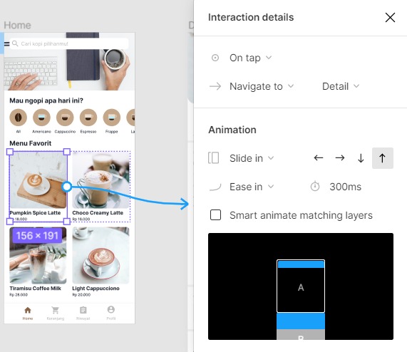 Supaya prototype kita benar-benar mirip seperti aplikasi aslinya, kita akan menambahkan animasi pada setiap aksi. Caranya cukup mudah, klik garis interaksi dan pilih jenis animasi pada bagian Animation.