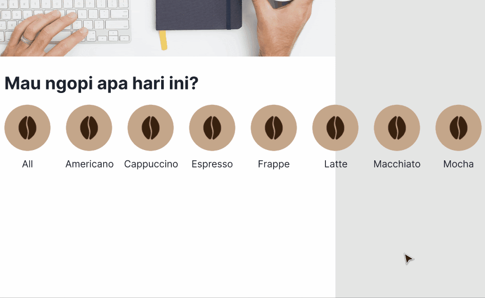 Di sini kami akan mencontohkan untuk menambahkan dua kategori baru pada list kategori tersebut. Namun sebelum itu, non-aktifkan dulu konfigurasi Clip Content pada Frame Home supaya dapat melihat setiap elemen seperti berikut: