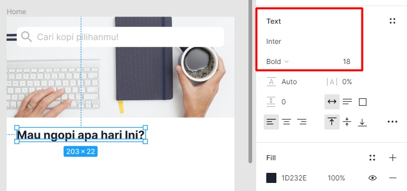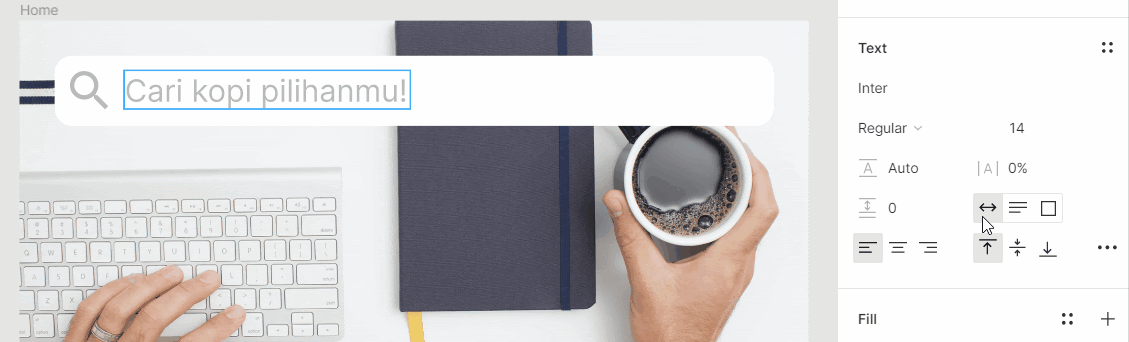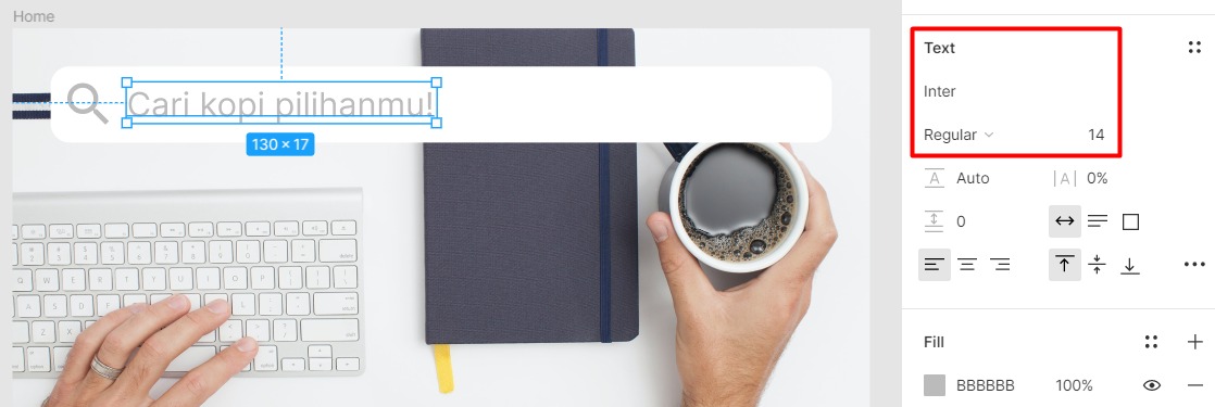 Nah, mulai dari sini kita juga akan memikirkan tentang tipografi. Jika dilihat, teks di atas terlalu tebal untuk sebuah petunjuk kolom pencarian, maka di sini kita memilih font Inter dengan jenis Regular dan ukuran 14. Anda dapat mengubahnya pada properti Text pada panel sebelah kanan. Hasilnya terlihat seperti ini:
