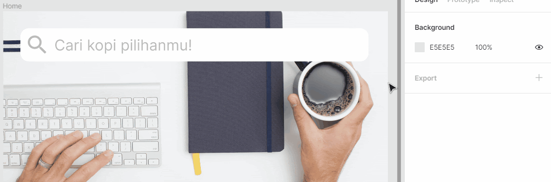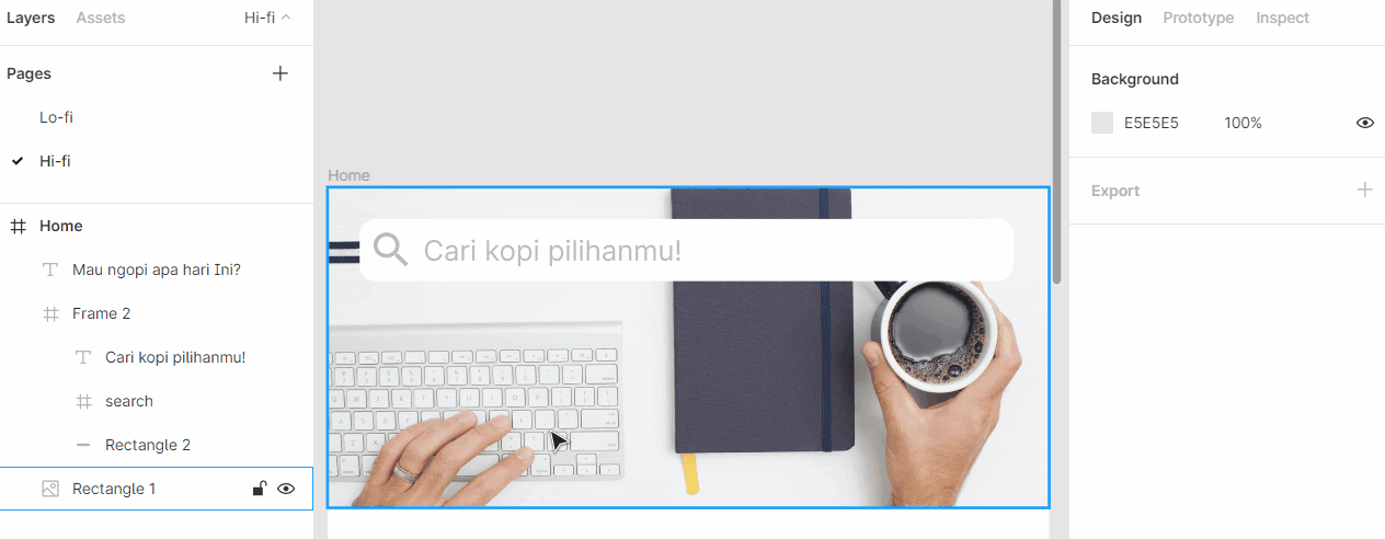 - Sebelum lanjut ke bagian filter kategori, Anda perlu menggabungkan elemen-elemen pada kolom pencarian. Jika pada latihan Wireframe kita menggabungkan elemen menggunakan fitur Group, di sini kita menggunakan Frame. Supaya mengetahui perbedaannya, ubahlah ukuran Group dan lihat apa yang terjadi.