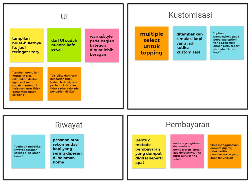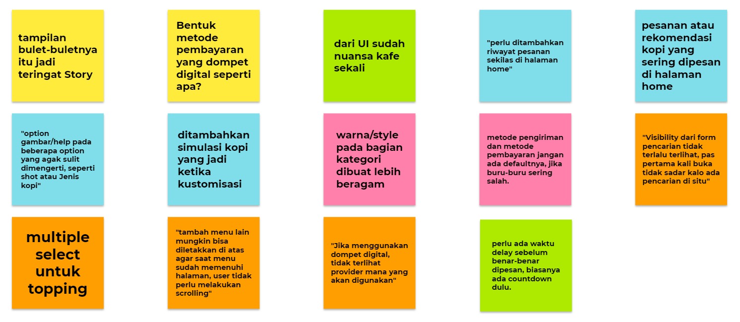 Tambahkan setiap jawaban partisipan yang berisi feedback atau pendapat ke dalam satu sticky note. Gunakan warna yang berbeda pada setiap partisipan untuk memudahkan Anda mengidentifikasi partisipan seperti ini: