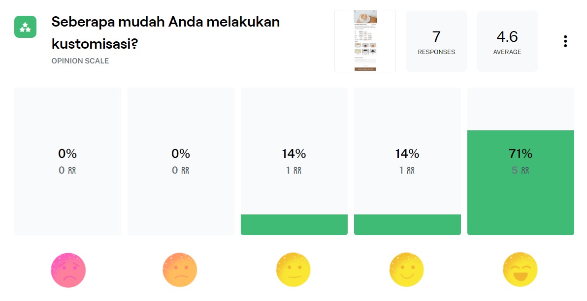Anda dapat menggunakan blok Opinion Scale untuk memberikan pertanyaan yang bersifat kuantitatif seperti ini: Anda juga bisa menambahkan gambar untuk membantu partisipan memahami konteks pertanyaan. Selain itu, Anda juga dapat mengatur skala jawaban dan jenis skala, apakah berupa angka, bintang, atau emotikon.