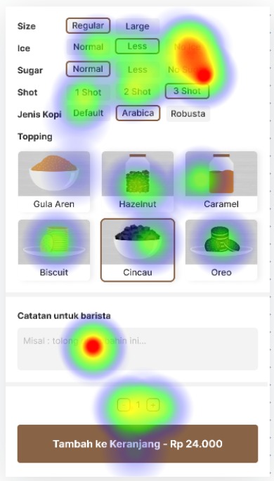 Setelah selesai membagikan link testing ke partisipan, tunggu sampai jumlah atau waktu yang sudah ditentukan. Anda dapat melihat hasil survei pada bagian Result seperti ini: Anda juga dapat melihat detail aktivitas dari setiap partisipan dengan melihatnya pada bagian Testers seperti ini: Jika memilih detail mission, Anda juga dapat melihat heatmap yang menunjukkan area yang sering ditekan seperti ini:Dengan informasi ini, Anda dapat menganalisis hasil dari Usability Study dengan lebih mudah pada tahap selanjutnya.Berikut ini adalah contoh report lengkap dari hasil testing aplikasi pemesanan kopi.