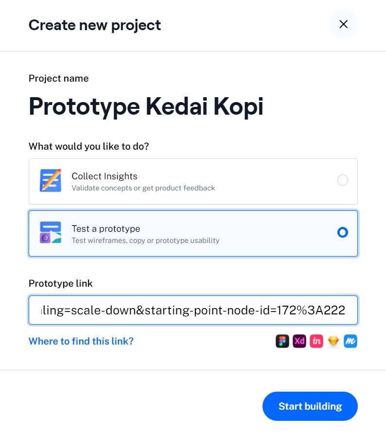 Pada block Mission, Anda dapat menambahkan aksi yang perlu dilakukan partisipan. Silakan isi Task, Description, dan Prototype. Pada bagian Add Prototype, masukkan Prototype link yang didapat dari Figma. Apabila Anda lupa, link bisa didapatkan dari tombol berikut ketika menjalankan prototype.