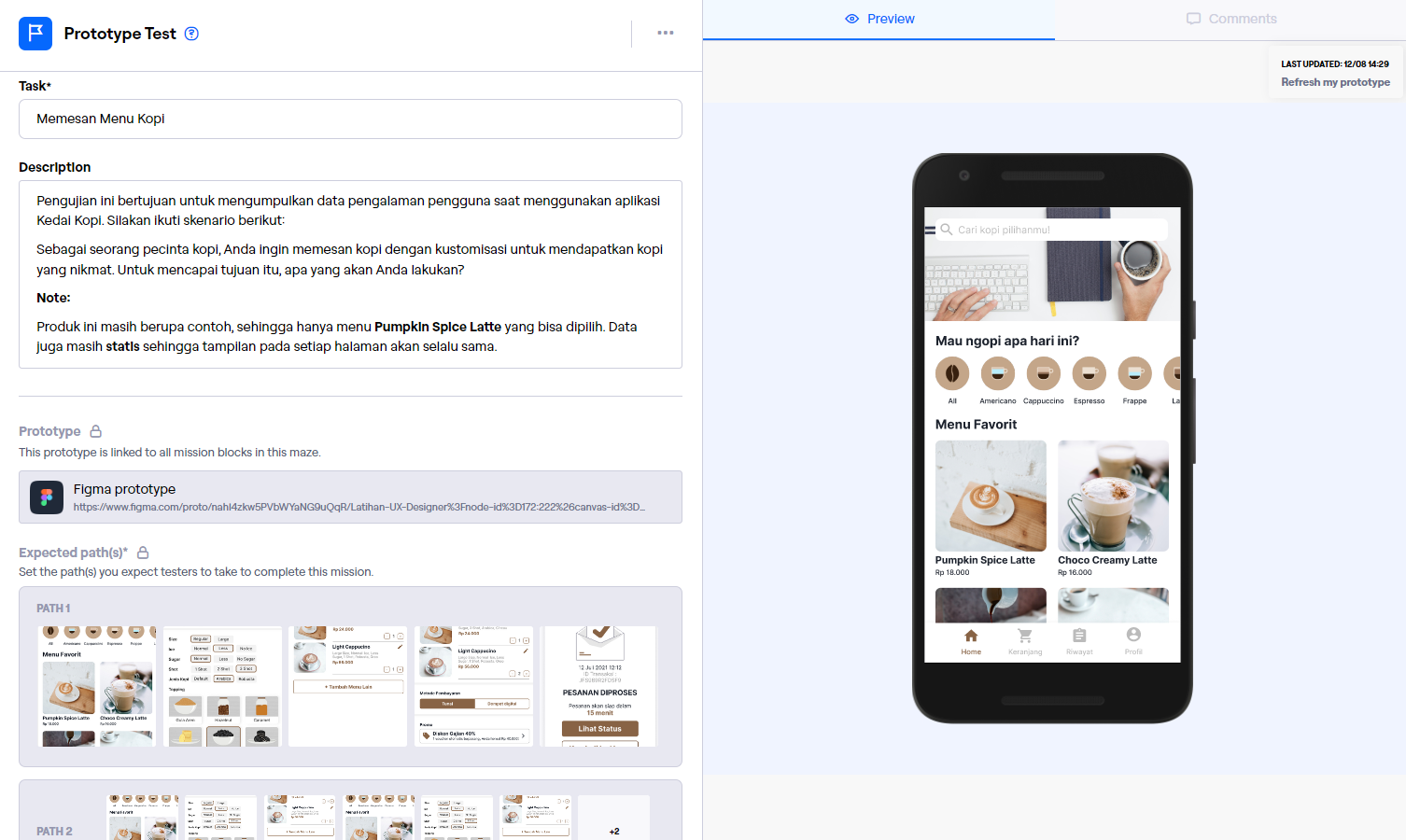 Sebelum menjalankan testing dengan Start testing, sebaiknya Anda melihat pratinjaunya terlebih dahulu dengan klik Preview. Berikut adalah contoh preview dari aplikasi pemesanan kopi: Usability Testing Aplikasi Pemesanan Kopi dengan Maze