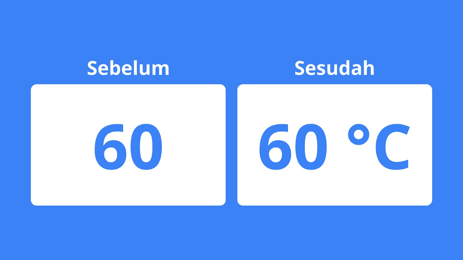 Apakah Anda melihat perbedaannya? Setelah ditambahkan satuan derajat celcius °C, Anda tidak lagi berasumsi banyak hal seperti sebelumnya. Sebab, Anda sudah tahu pasti angka 60°C tersebut merepresentasikan derajat suhu.