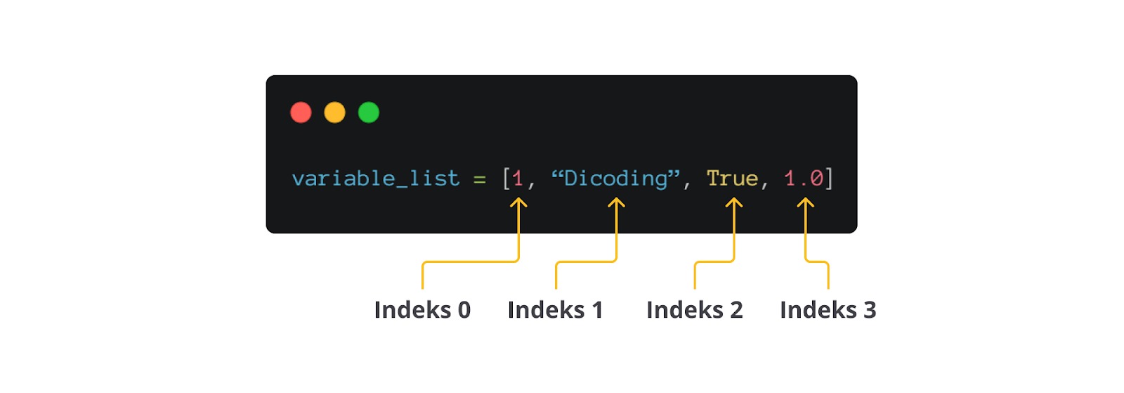 Melakukan inisialisasi list pada Python cukup mudah, yakni menggunakan kurung siku “[]” dan setiap elemennya dipisahkan dengan koma. Berikut adalah implementasi list pada Python.
