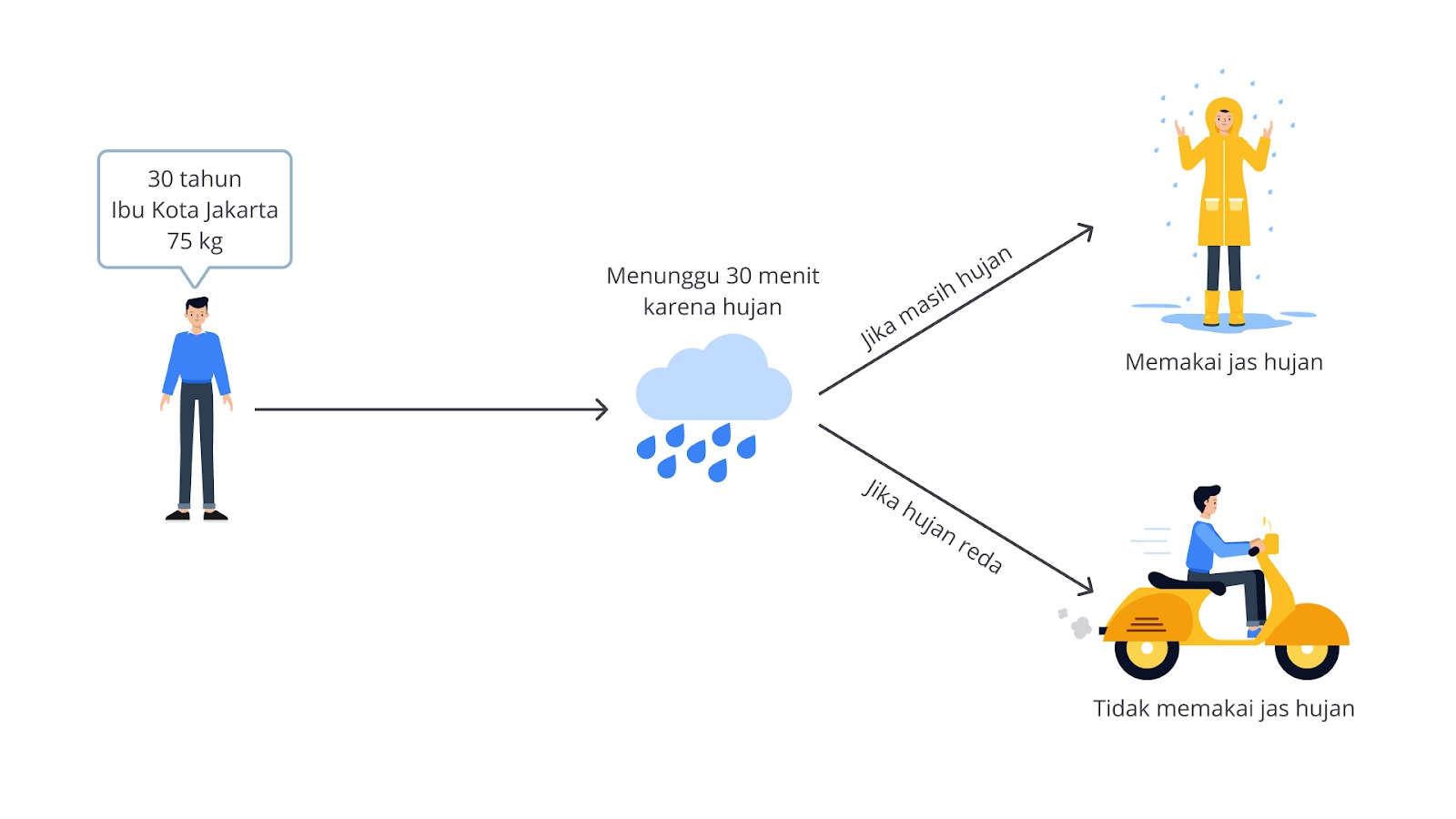- Keputusan Memakai Jas Hujan Keputusan memakai jas hujan juga merupakan data. Dalam pemrograman, ini adalah data boolean yang merupakan tipe data dengan hanya dua kemungkinan, yakni True dan False. Dalam kisah di atas, keputusan Evans hanya ada dua, yakni jika hujan benar-benar terjadi (bernilai True), ia akan memakai jas hujan, sedangkan jika hujan tidak terjadi (bernilai False), ia tidak akan memakai jas hujan.