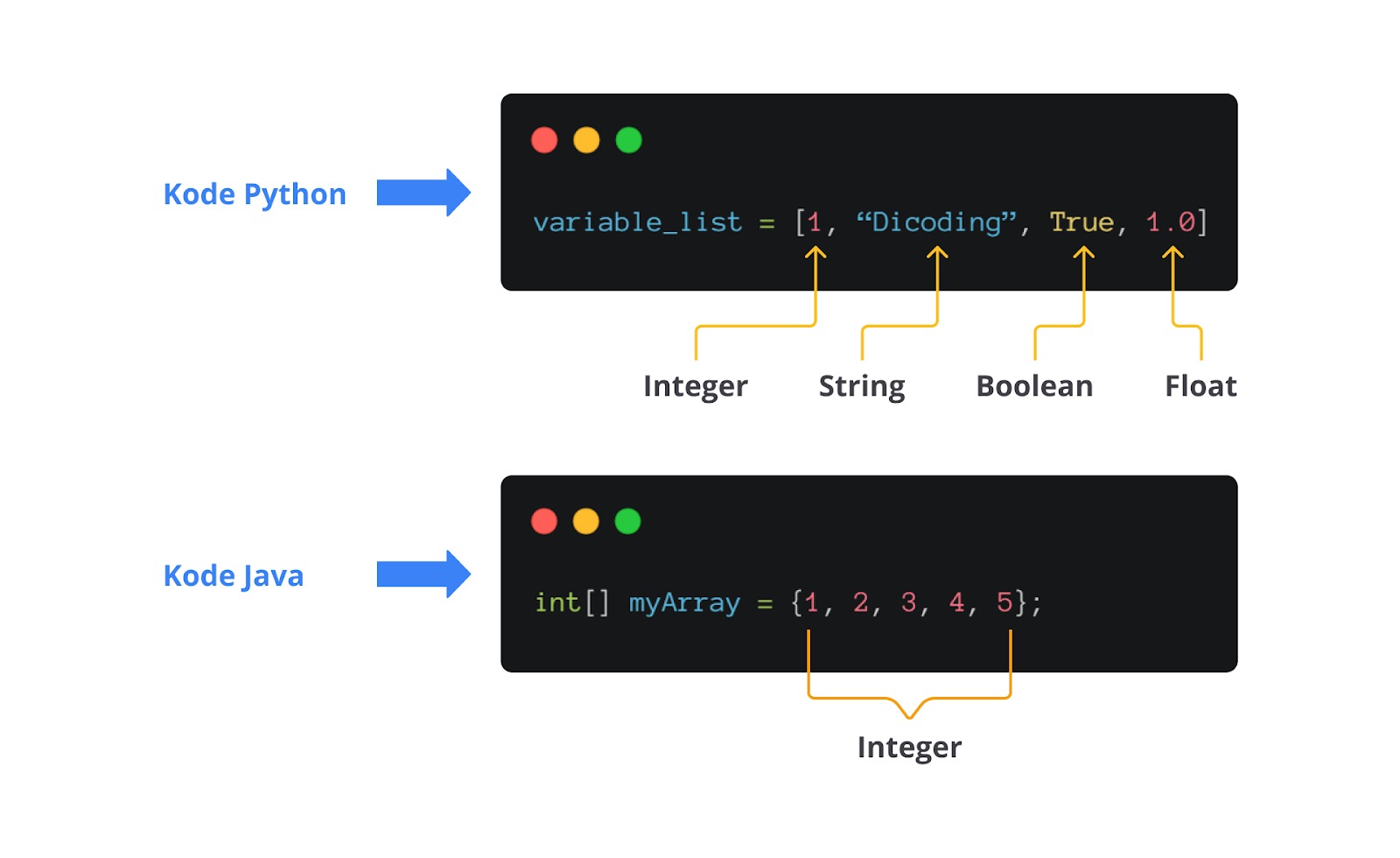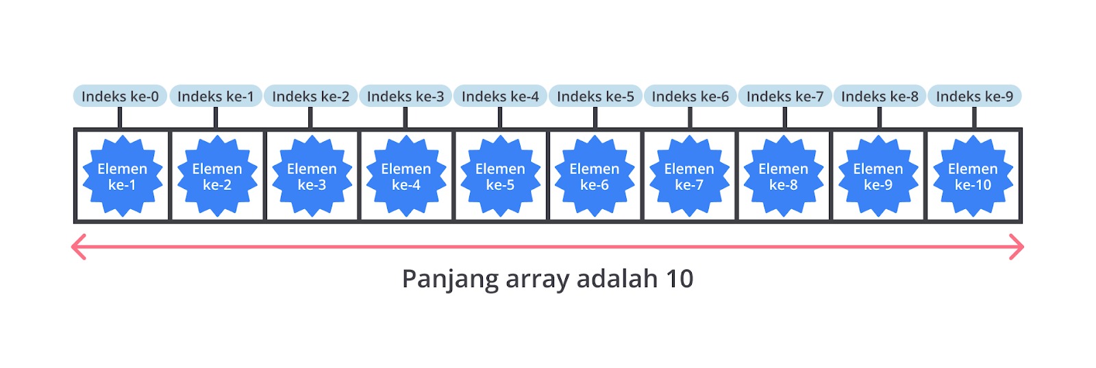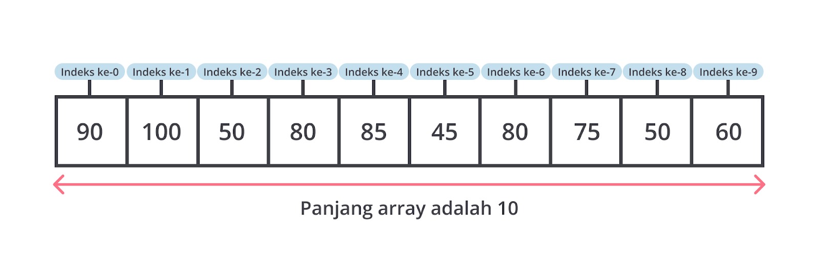 - Indeks: Posisi atau nomor yang digunakan untuk mengidentifikasi elemen-elemen dalam array. Indeks selalu dimulai dari 0.