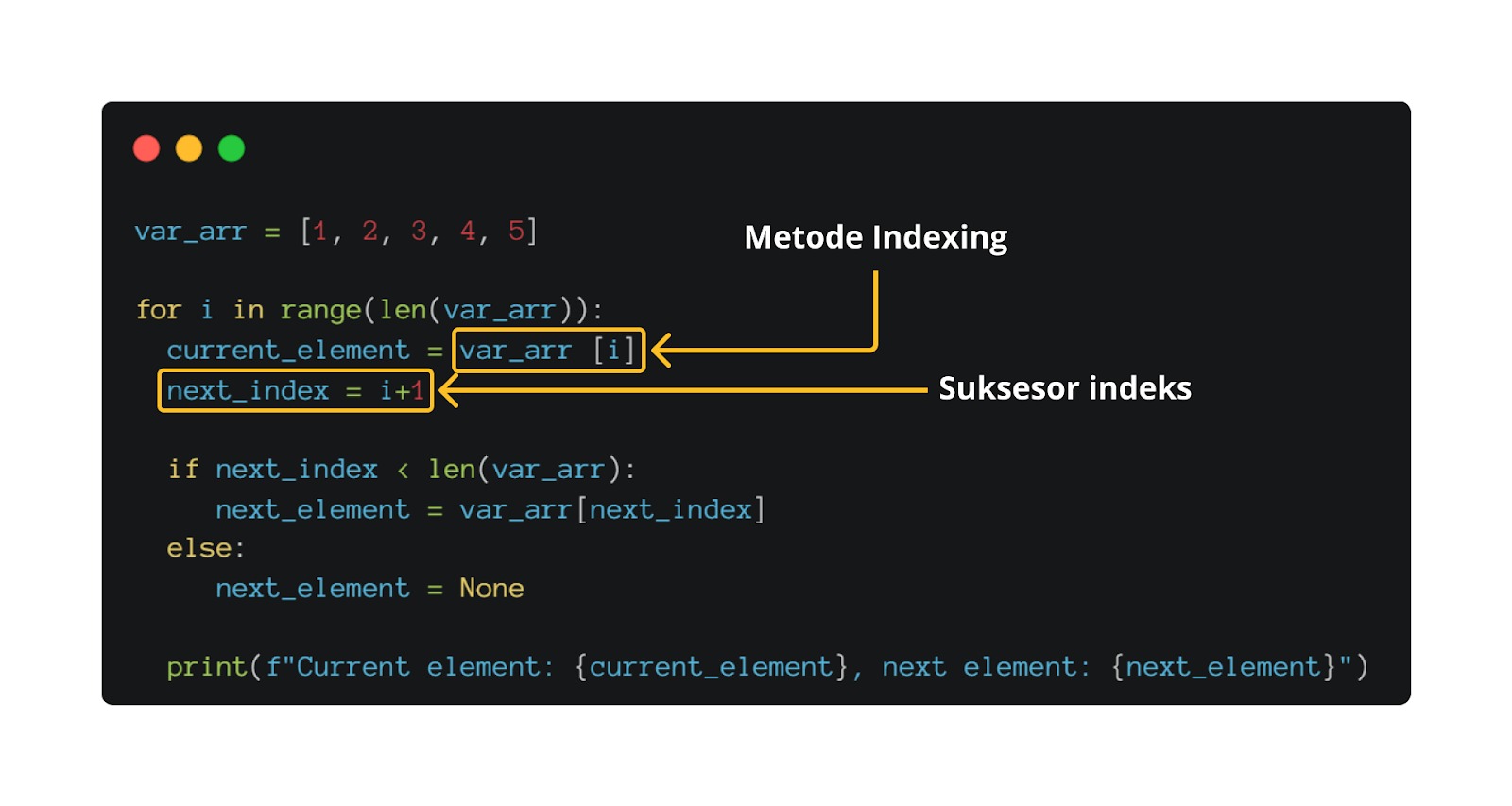 Kemudian kita memeriksa “next_index” berada dalam rentang indeks yang valid dalam array atau tidak. Jika iya, artinya masih ada elemen berikutnya, dan kita ambil elemen berikutnya tersebut menggunakan “var_arr[next_index]” serta menyimpannya dalam variabel “next_element”. Sebaliknya, jika “next_index” tidak valid atau melebihi rentang array, artinya tidak ada elemen berikutnya sehingga kita menetapkan “next_element” sebagai “None”.