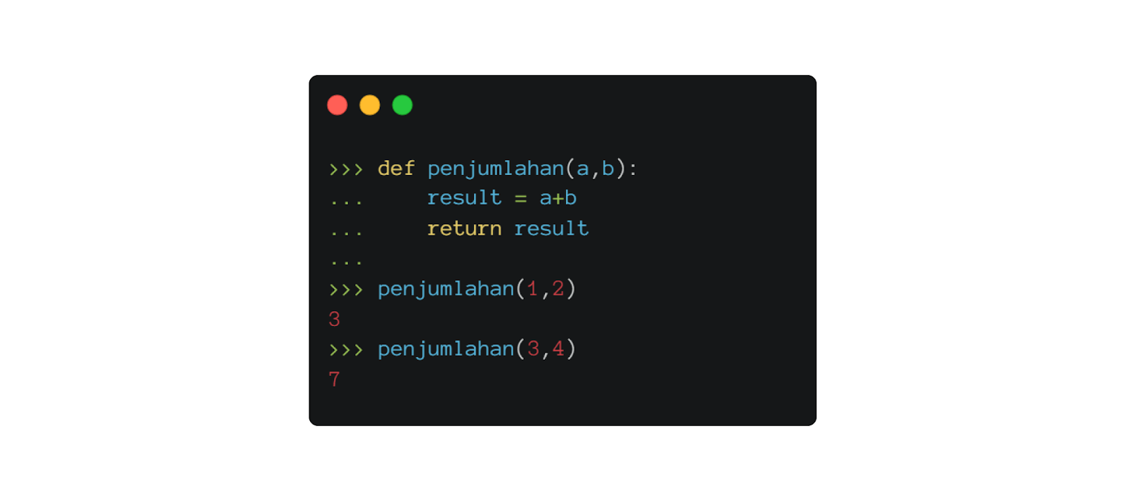 - Terakhir, kita menggunakan return keyword yang merupakan bagian dari return statement. Return statement bertujuan untuk mengembalikan nilai atau hasil eksekusi fungsi tersebut. Dalam contoh di atas, kita mengembalikan variabel “luas_persegi_panjang” sebagai hasil dari proses eksekusi fungsi.