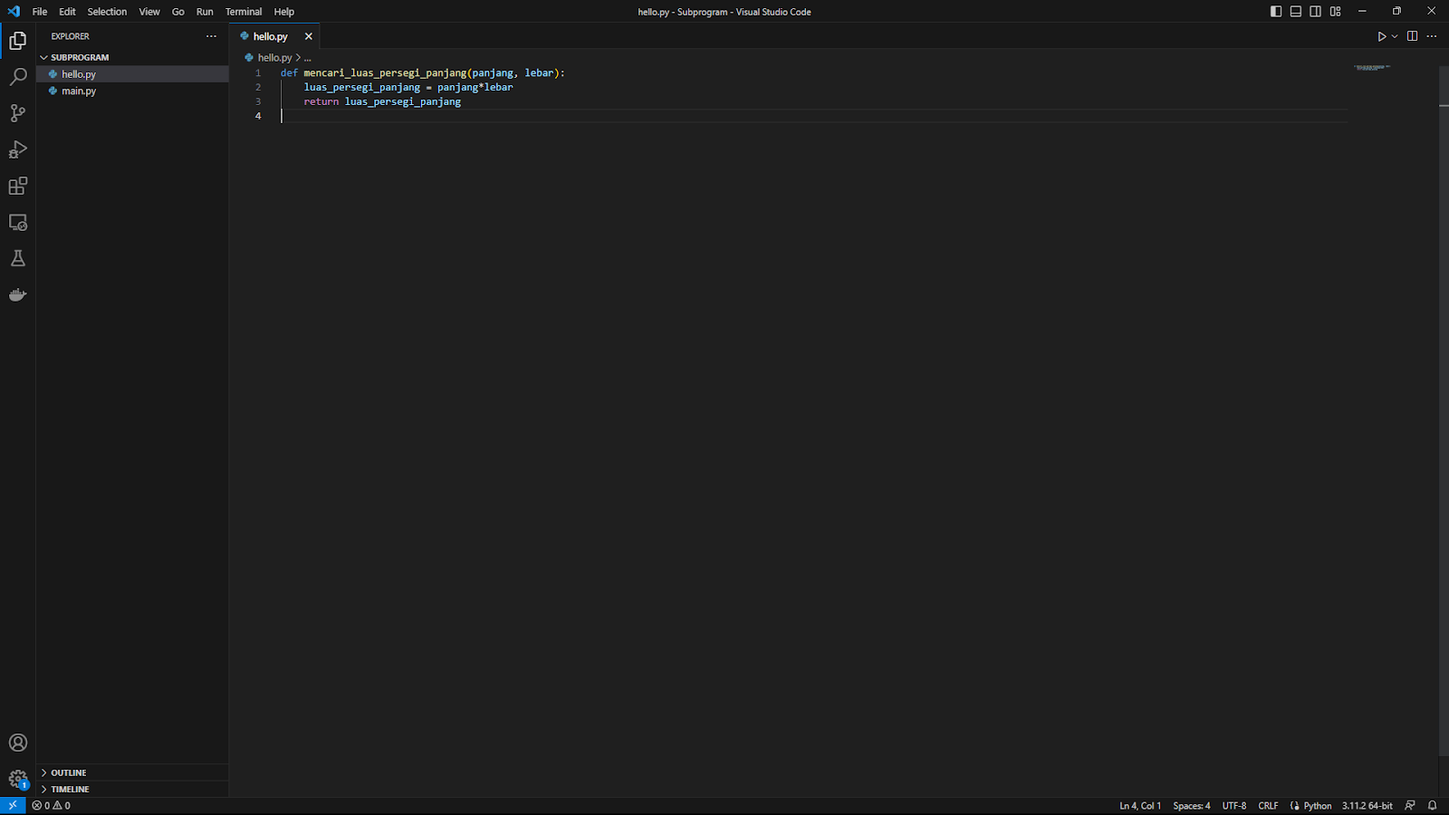 Kode di atas merupakan fungsi untuk mencari luas persegi panjang dengan parameter panjang dan lebar. Kita akan memanggil fungsi ini pada file Python lain.