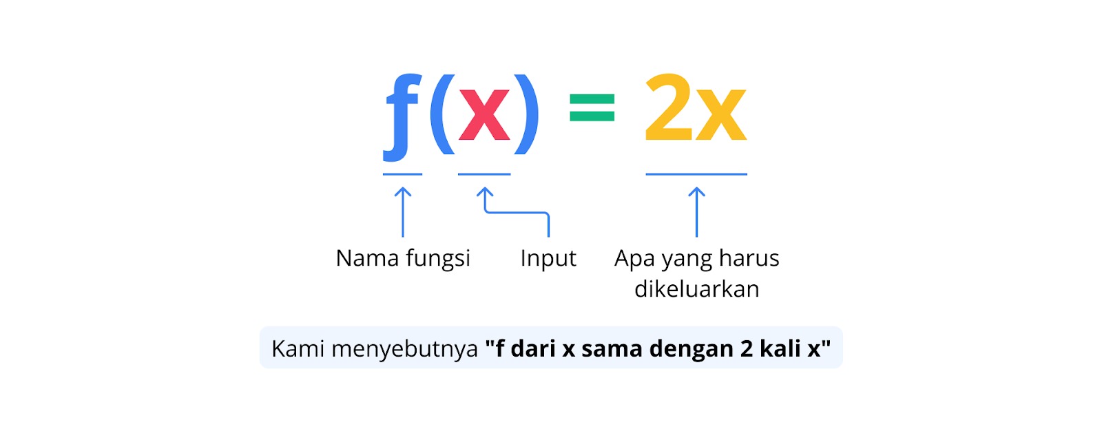 Notasi f(x)=2x menunjukkan bahwa fungsi “f” mengambil “x” dan mengalikannya dengan 2.