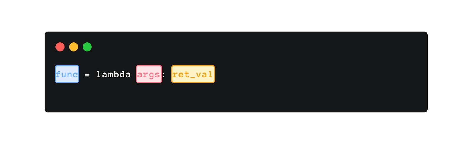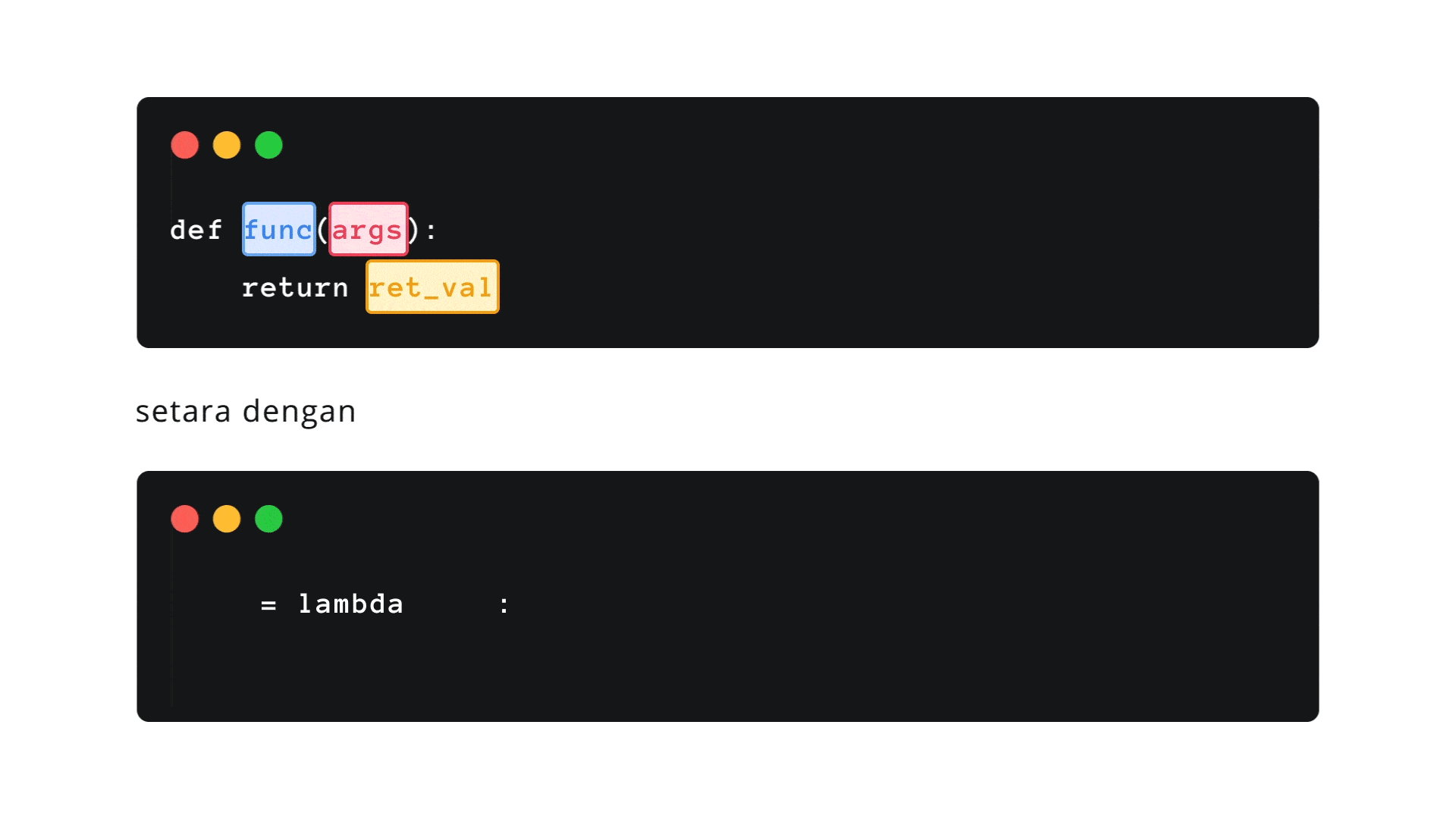 Nama fungsi (func) setara dengan nama variabel yang digunakan untuk menyimpan ekspresi lambda, args adalah argumen yang dibutuhkan untuk dioperasikan, dan ret_val merupakan nilai yang kita kembalikan (return).