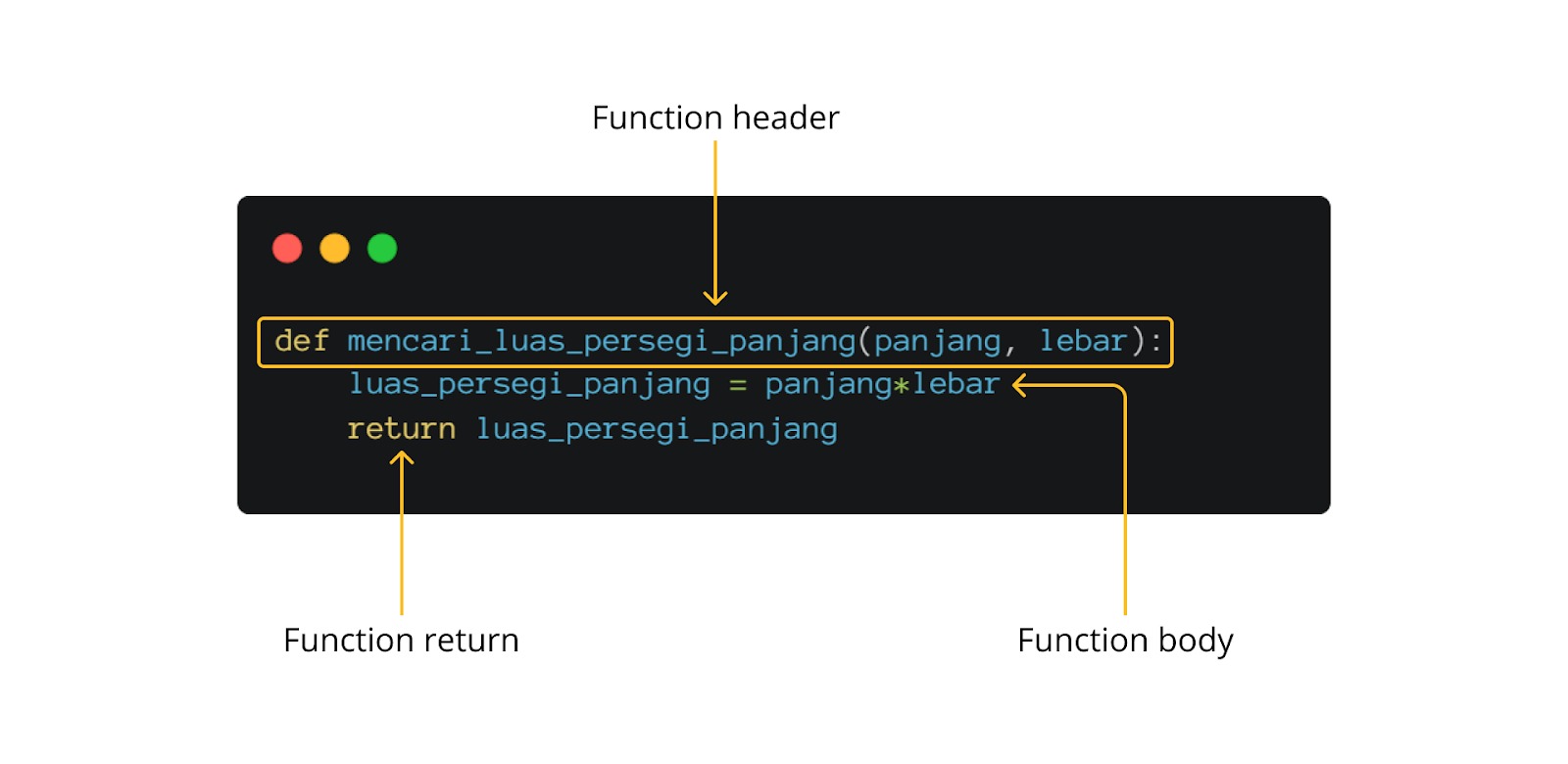 - Setelah function header selesai, selanjutnya kita definisikan function body yang berisi kode untuk dieksekusi. Dalam contoh mencari luas persegi panjang, kita memasukkan rumus luas persegi di bagian ini. Hasil dari rumus tersebut disimpan dalam variabel “luas_persegi_panjang”.