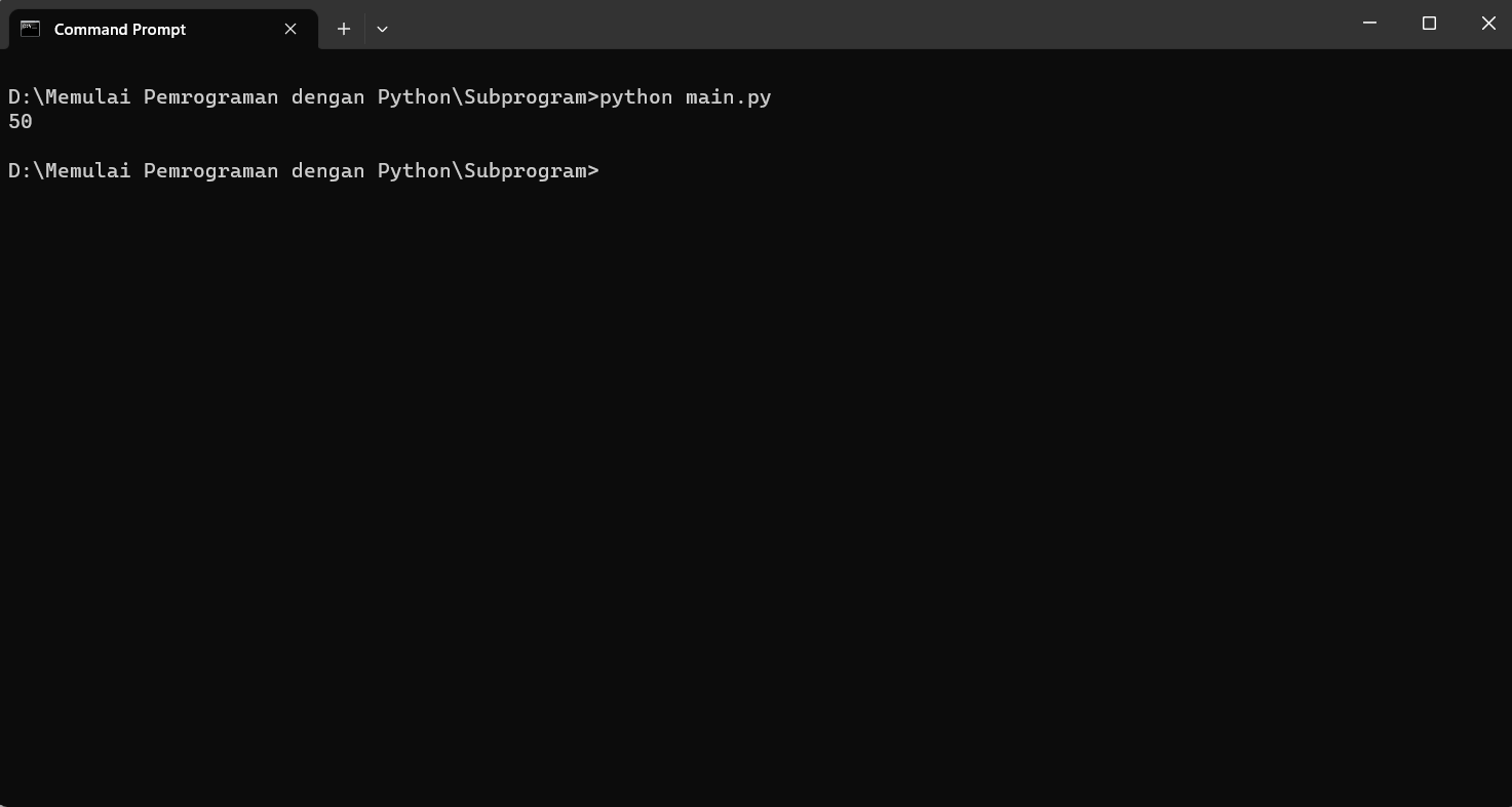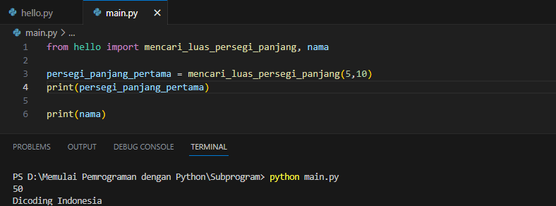 Pertama, kita perlu mengimpor file berisi fungsi yang sebelumnya dibuat dengan cara mendefinisikan “import hello”. Ingat bahwa hello adalah nama file kita sebelumnya. Baris kedua dan seterusnya adalah cara yang sama dengan yang telah kita pelajari. Namun, perbedaannya adalah kita memanggil fungsi memakai cara “hello.mencari_luas_persegi_panjang(5,10)” dengan hello adalah nama modul atau file yang telah kita impor. Sekarang, jalankan file main.py pada terminal Anda. Gunakan kode di bawah ini dan pastikan terminal yang Anda buka sedang berada pada direktori yang sama dengan file yang telah dibuat.Hasilnya, terminal Anda akan menampilkan output program tersebut. Berikut contohnya.