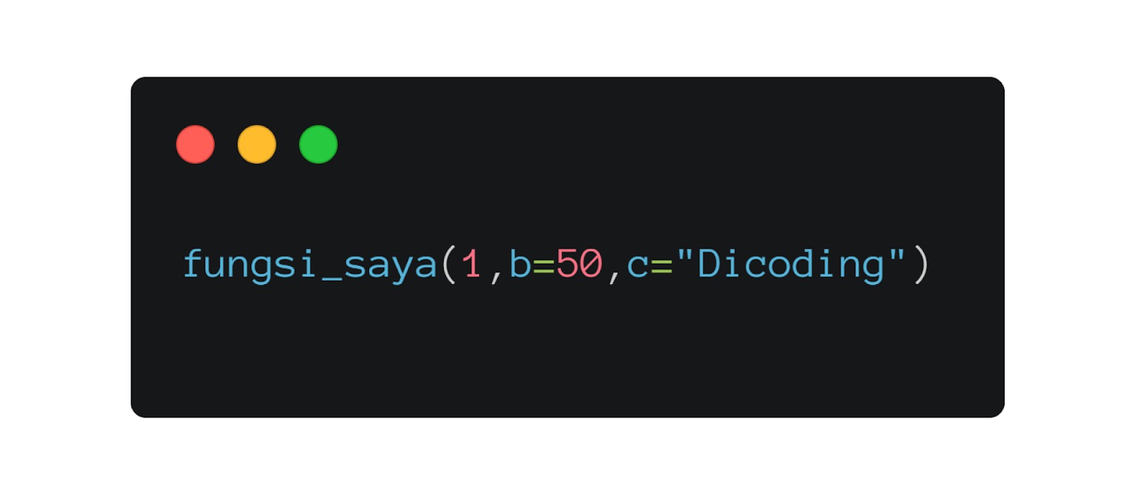 Ketika Anda membuat fungsi di atas, a, b, c merupakan parameter. Namun pada saat Anda memanggilnya, nilai 1, b=50, c=‘Dicoding’ menjadi argumen.