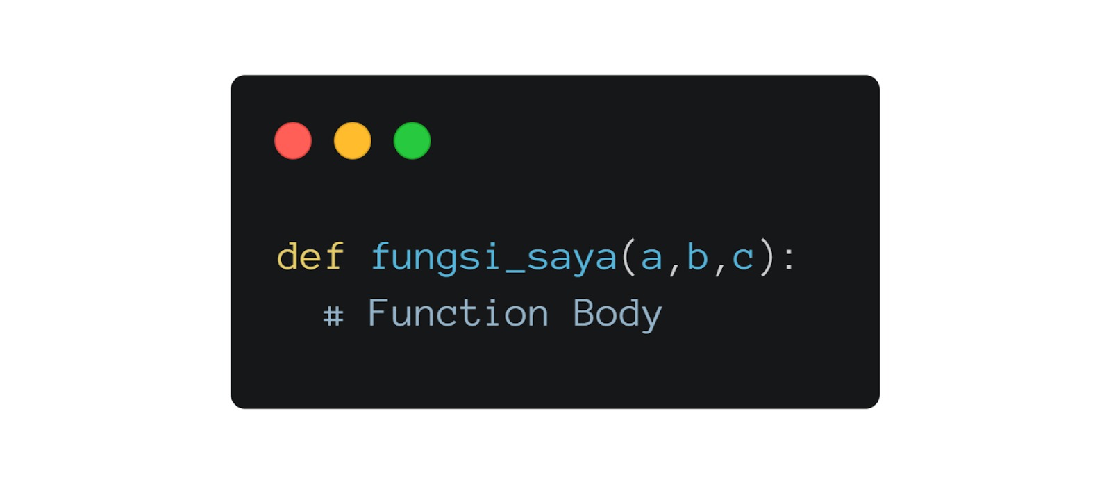 - Function body adalah blok kode yang diindentasi setelah header fungsi menentukan hal yang dilakukan fungsi tersebut. Kita menentukan semua kode yang akan dibuat dalam function body. Ingat bahwa bagian ini adalah blok kode sehingga Anda harus memperhatikan indentasi untuk menghindari kesalahan.