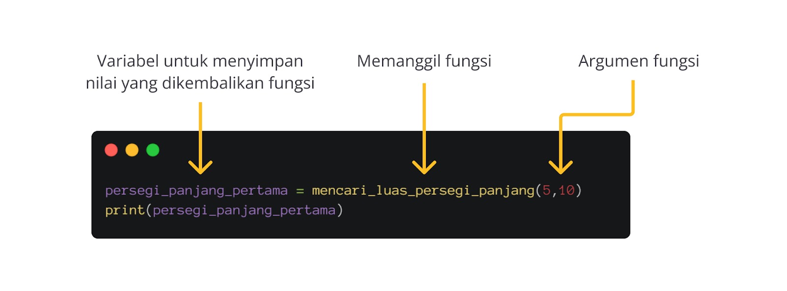 | Fungsi | Blok kode yang dapat digunakan kembali untuk mengeksekusi fungsionalitas tertentu saat dipanggil. | print(), len(), mencari_luas_persegi_panjang() |
