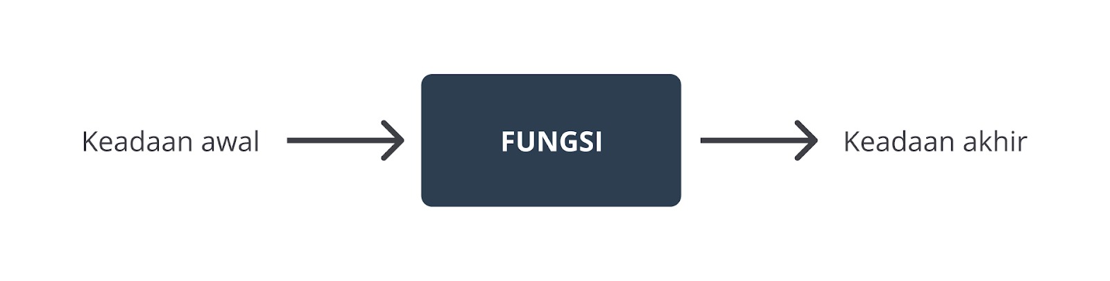 Selayaknya black box, kita tidak perlu tahu tentang hal yang terjadi di dalam kotak (fungsi) tersebut. Kita hanya perlu fokus pada keadaan awal yang merupakan himpunan nilai yang terdefinisi sebagai input (domain) dan keadaan akhir yang merupakan himpunan nilai yang terdefinisi sebagai output (range).
