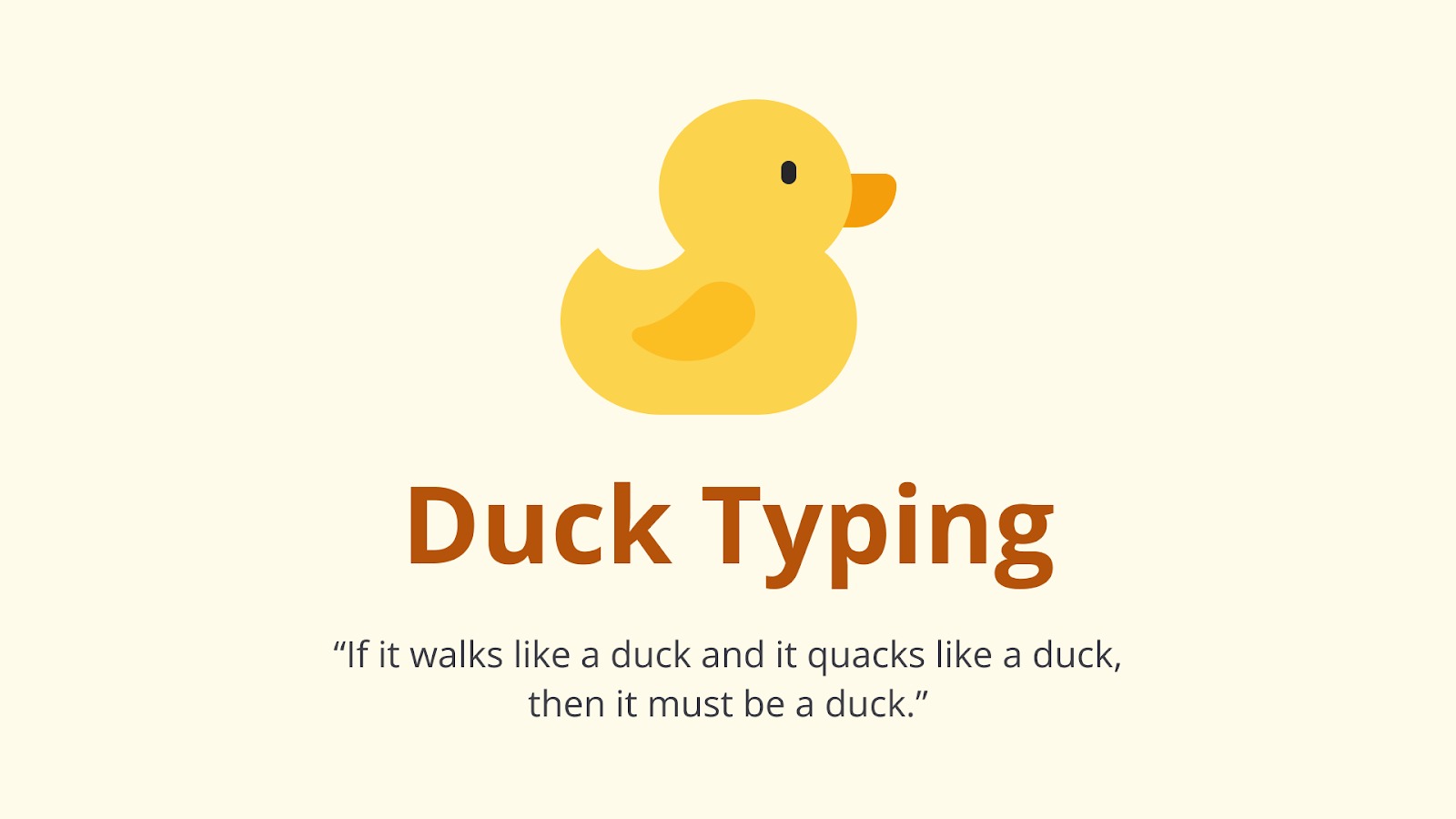 Konsep duck typing tidak berkaitan langsung dengan dynamic typing atau loosely typed, ini merupakan konsep yang lebih erat dengan materi kita kali ini, yaitu pemrograman berorientasi objek (object-oriented programming). Duck typing menjelaskan bahwa sebuah tipe atau class dari sebuah object tidak lebih penting daripada method yang menjadi perilakunya.