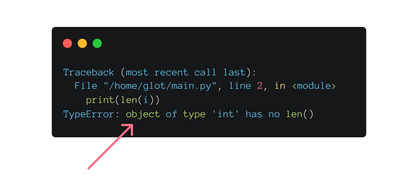 Pesan error tersebut menyatakan bahwa objek dengan tipe data “int” tidak memiliki len() yang tersedia, padahal seharusnya method tersebut diharapkan untuk ada. Python secara alami akan memeriksa jika object yang Anda buat memiliki method yang diharapkan atau tidak. Dalam contoh di atas, program menghasilkan error karena object tipe data ‘int’ tidak memiliki method len().